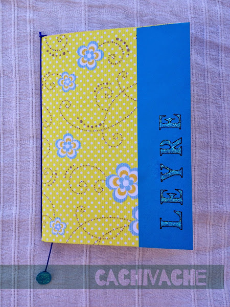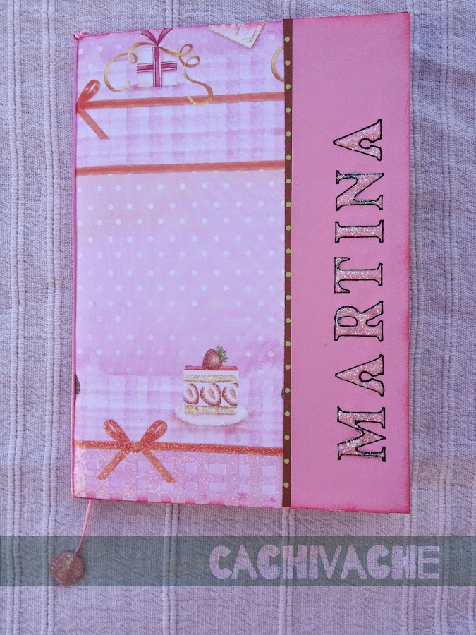 Forrar la libreta con el papel decorado y cortar el sobrante. Añadir lo que falte de cartulina, Rotular los nombres. Colocar el cordón de cola de ratón a modo de marcapáginas, para ello troquelar una forma en cartulina y pegarla en el extremo. Decorar con 3D en purpurina.
