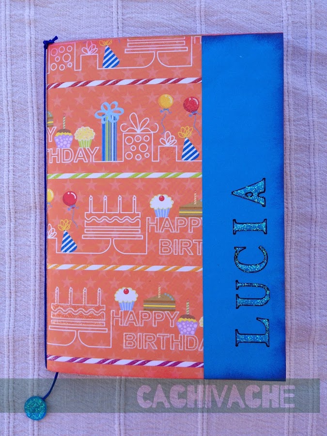 Son muy fáciles de hacer y quedan muy resultonas. Y los materiales sencillos: una libreta, papel decorado, cartulina, cola de ratón fina, cinta de doble cara, regla para letras y 3D de purpurina.