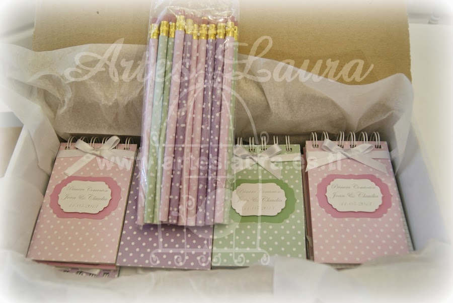 Para Alejandra (Algeciras), que hará su Primera Comunión el próximo 25 de Abril y quien repartirá estas libretitas tan cucas a sus invitados. Todas iguales en tonos rosas con topitos y bolígrafo a juego. Que pases un día estupendo en familia!!!