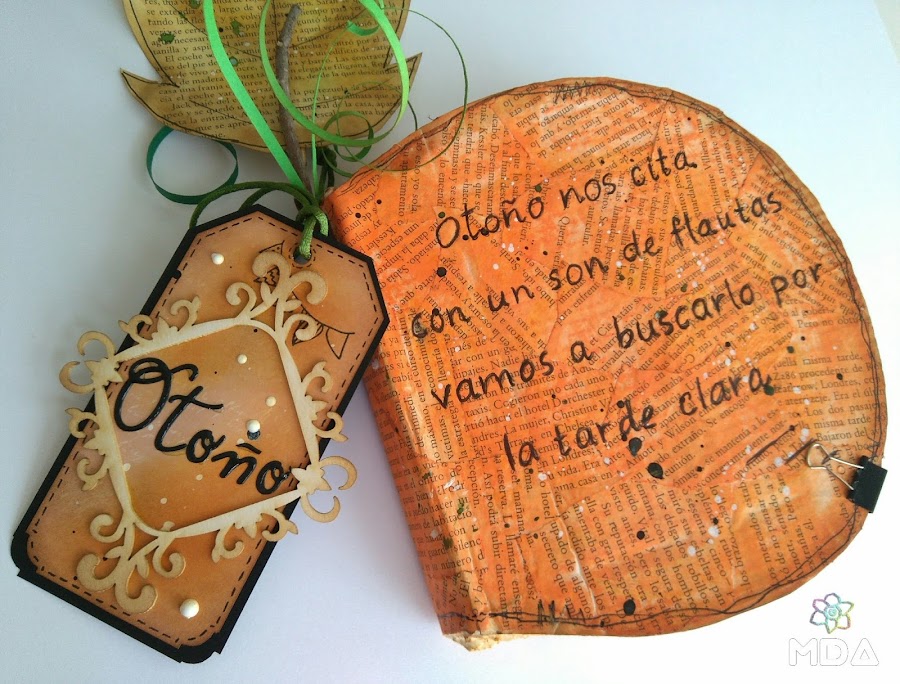 Para mi scraproom he hecho una calabaza muy otoñal con un libro viejo. Además, he incluido una hoja hecha también con una página del libro y un tag que lleva un chipboard de Kora Projects muy bonito.