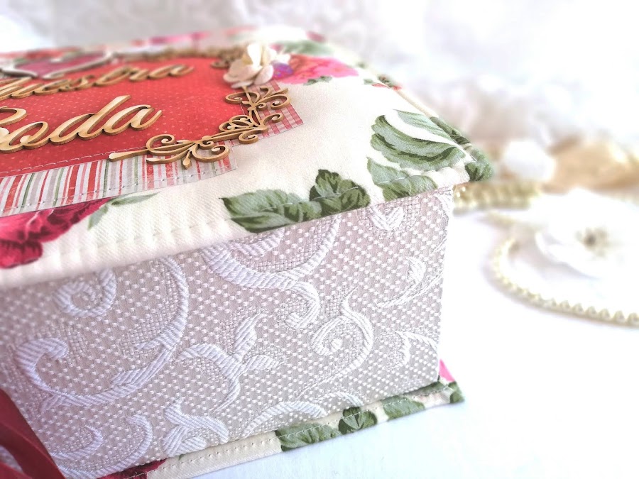 Una caja a juego realizada al mismo estilo y las mismas telas que el libro. Los colores fueros elegidos por la novia dado que la boda sería en estos tonos, el estilo también tenía que ser "muy recargadito" :) y aquí me lucí, puse muchas cosas y trabajé súper agusto :)