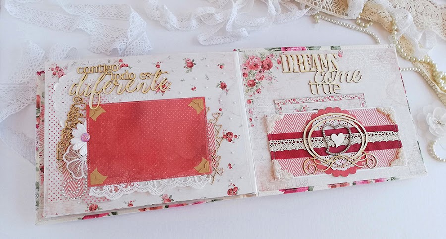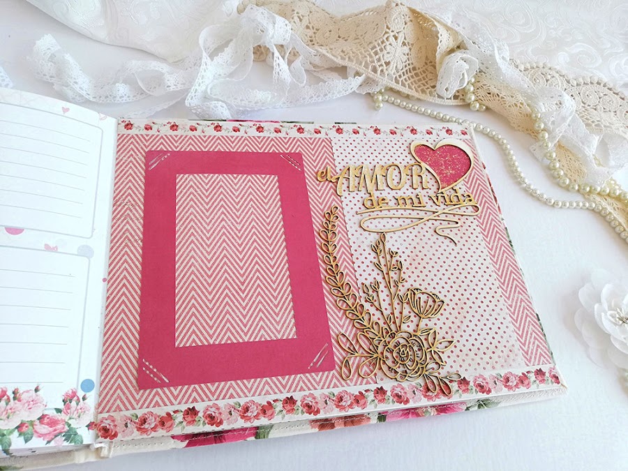 Una parejita de chipboard, flores de papel, un marco de chipboards... todo hace que la página luzca y agrade la vista.