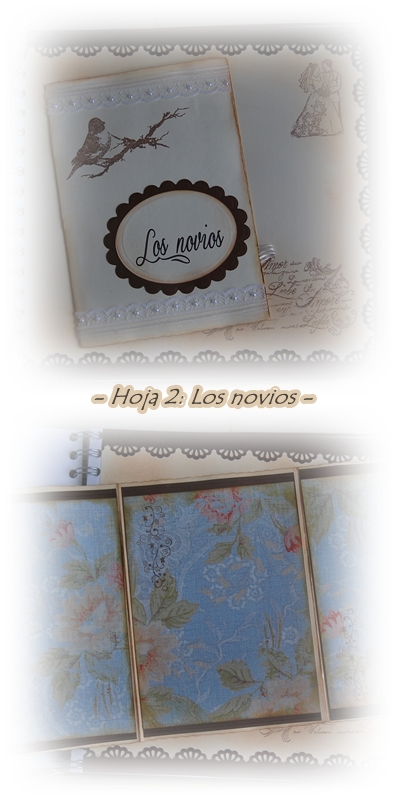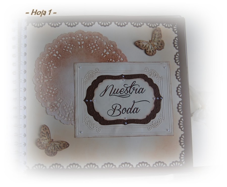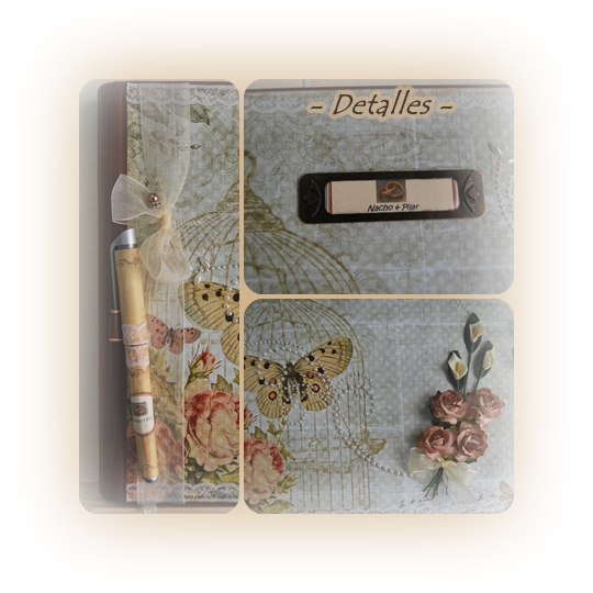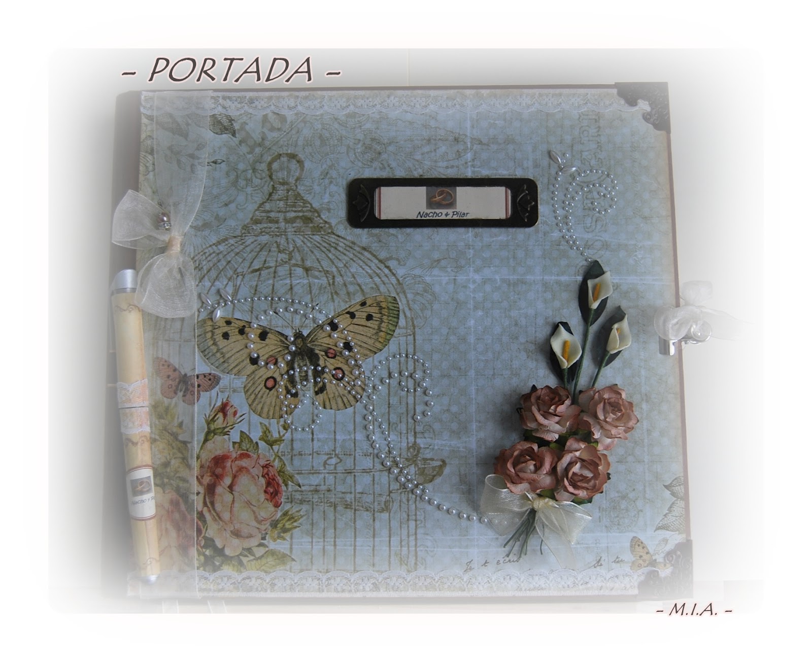 Volví a usar papeles de la Colección Butterfly Garden de Pink Paislee que me encanta y, como de por sí ya es bonita, en la Portada solo puse un arabescos de perlas Pebbles - Mr & Mrs , un pequeño bouquette de flores y en las esquinas unas terminaciones de Tim Holtz Idea-ology. En una placa puse los nombres de los novios y en un lateral un bolígrafo forrado y adornado con un pequeño encaje que luego usé en páginas interiores.