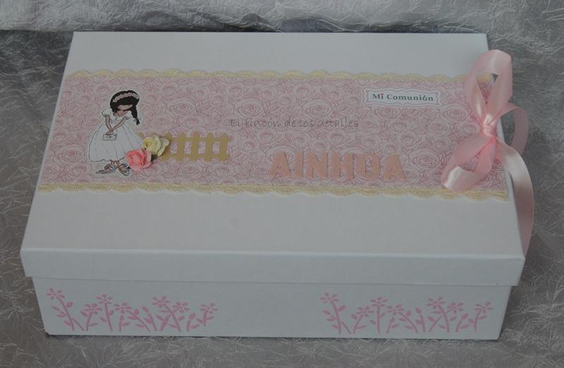 El libro de Comunión personalizado siempre va guardadito en su caja, también personalizada. Aquí podéis ver lo que os he comentado al principio del tamaño del lazo.