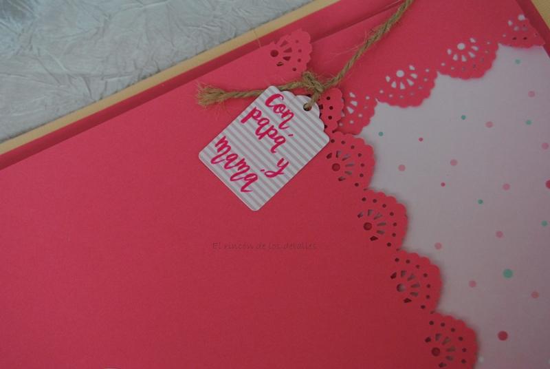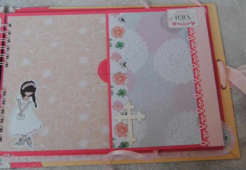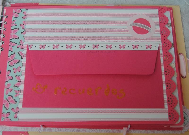 En este libro personalizado de Comunión puse el sobre que veis en la foto de arriba para que la niña pudiera guardar cosas como recordatorios de sus compañeros, oraciones…