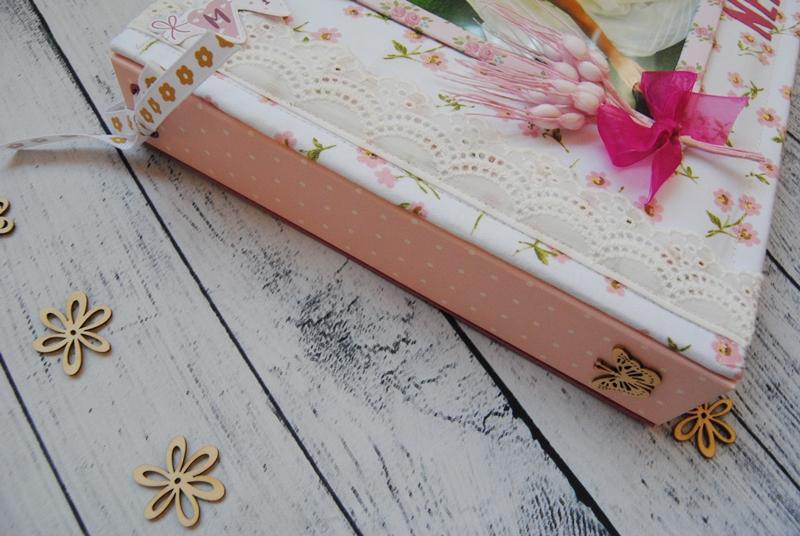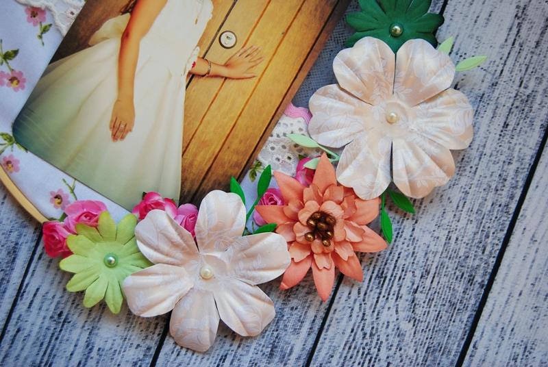 A juego con la portada cosí un trocito de la misma tela a un trocito de tul y entre ellas la puntilla. Las flores, de diversos modelos, le daban más alegría al conjunto.