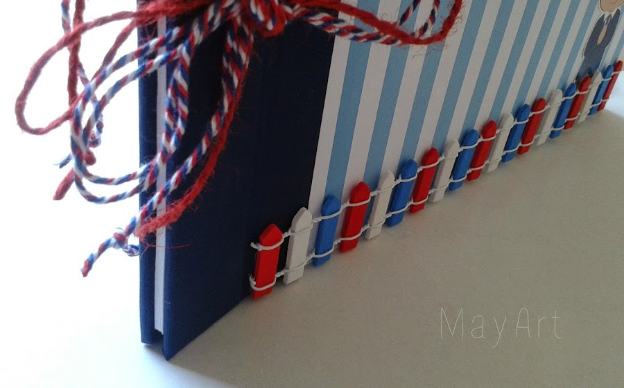 Está hecho íntegramente a mano, cortando las tapas a medida de las cartulinas interiores. Están forradas con un papel de líneas en azul y un lomo de tela en marino para que destacara junto con la chaqueta del niño.