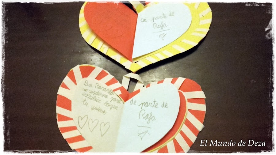 Si quieres, corta una tira pequeña, doblarla en forma de U y pega por detrás del corazón grande. Así podrás colgarlo si quieres.