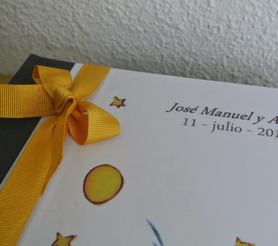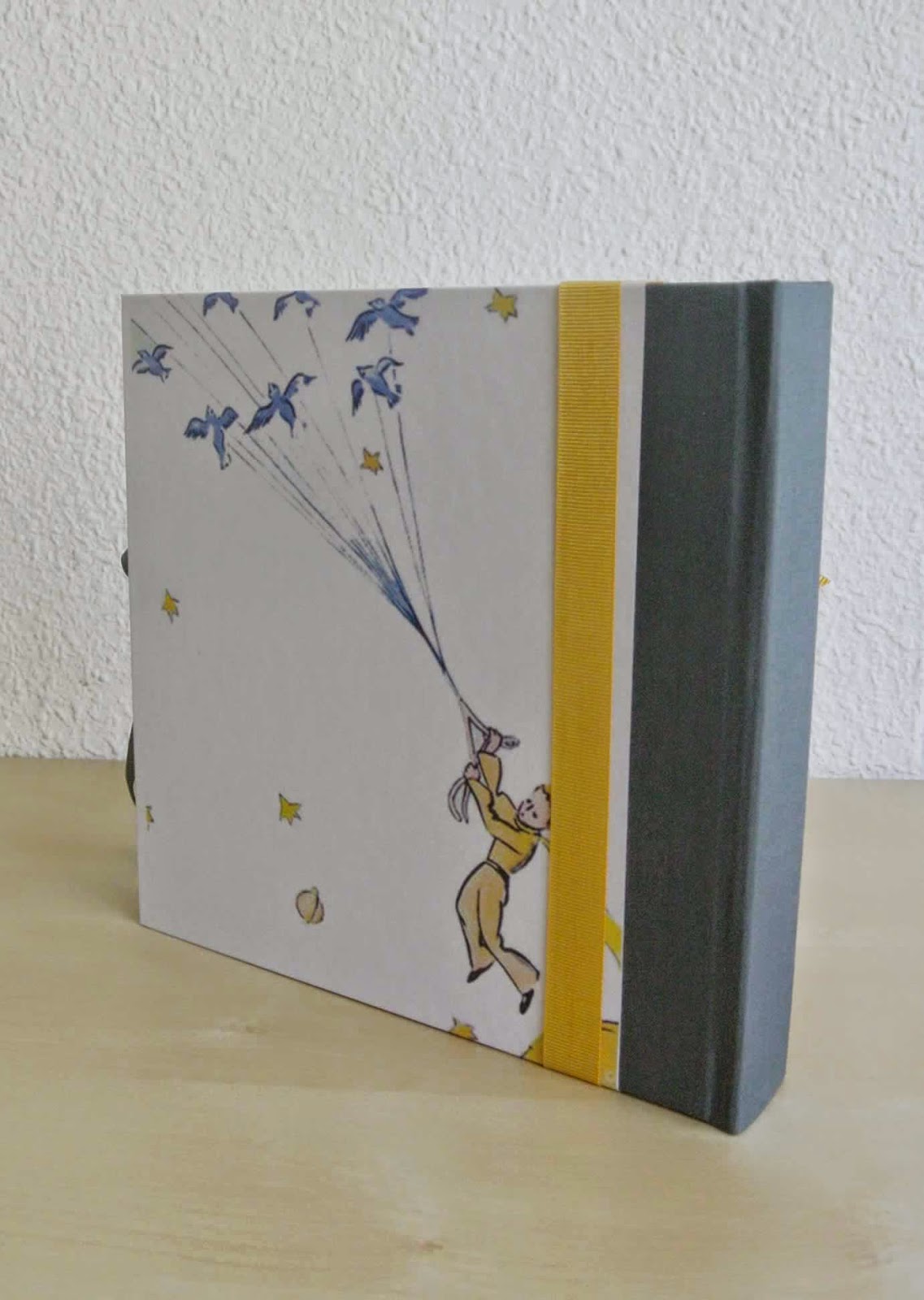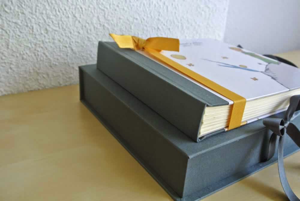 Tapas forradas con el diseño de "El Principito" y caja en tela gris a juego.