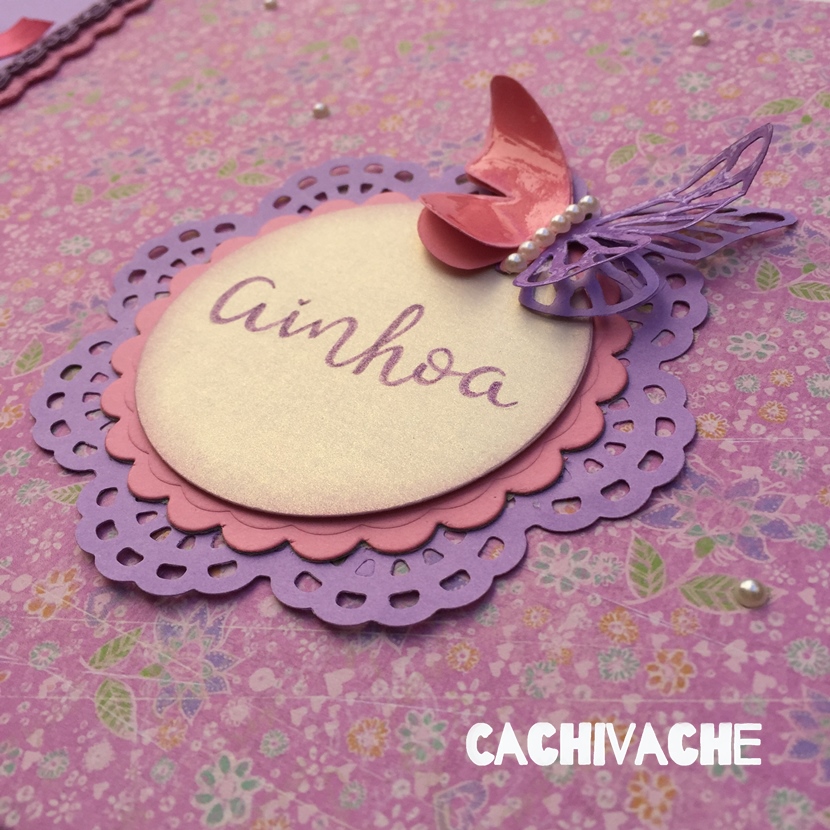 El nombre de Ainhoa en el rosetón, una mariposa 3D , esquineras en color plata...