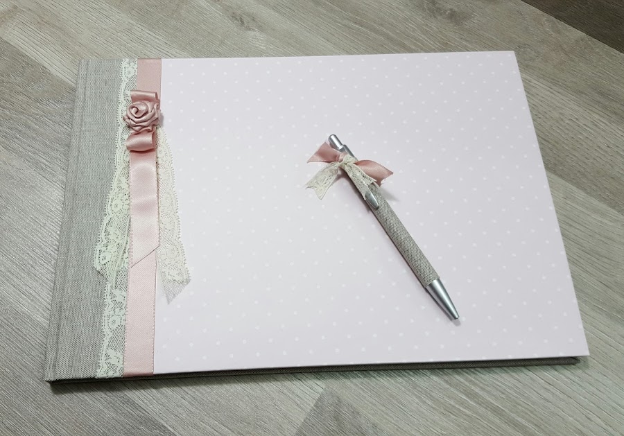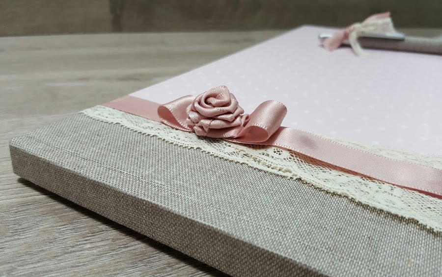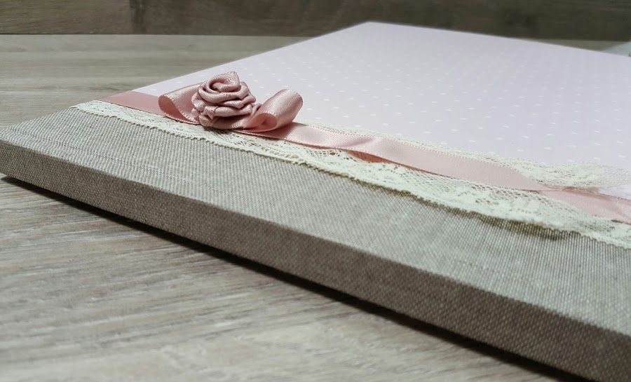 Tapas: Tela lino color en beige y papel decorado lunares, detalle cinta y puntilla.