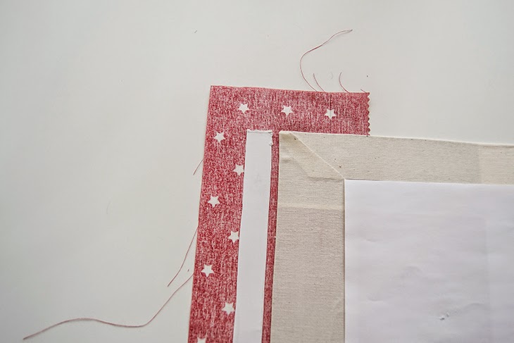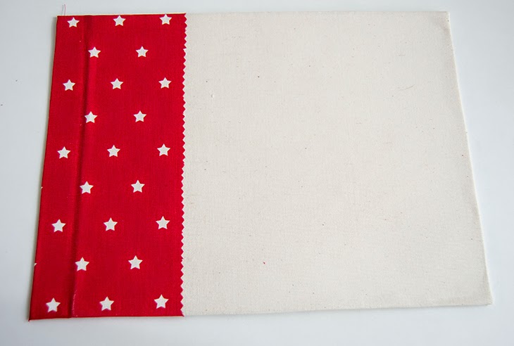 - Con la tela roja terminamos de forrar la tapa delantera, incorporando el rectángulo pequeño que habíamos cortado antes.