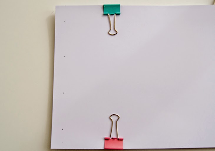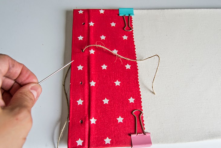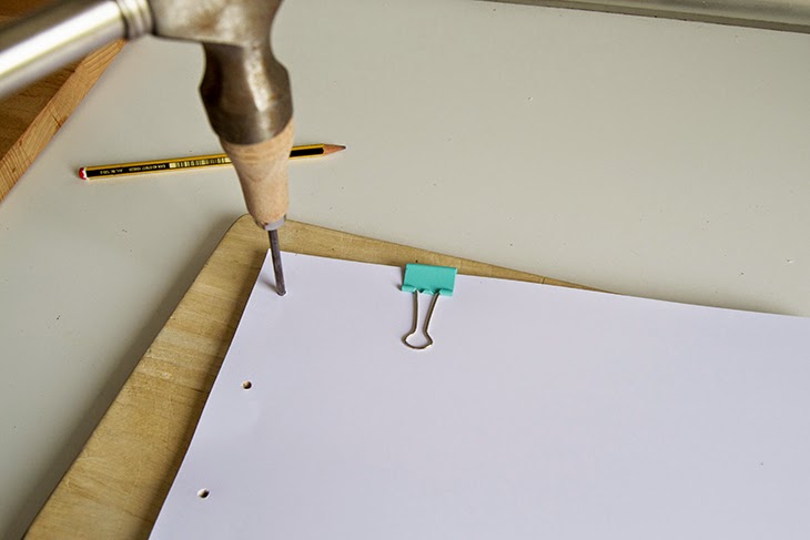 Una vez forradas las tapas, pasamos a hacer los agujeros en las hojas, a un centímetro del borde, utilizando un punzón y un martillo. Hacemos cuatro agujeros que queden simétricos respecto al centro y sujetamos las hojas con pinzas para que no se nos muevan