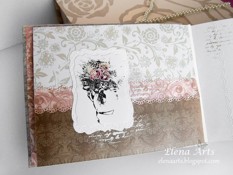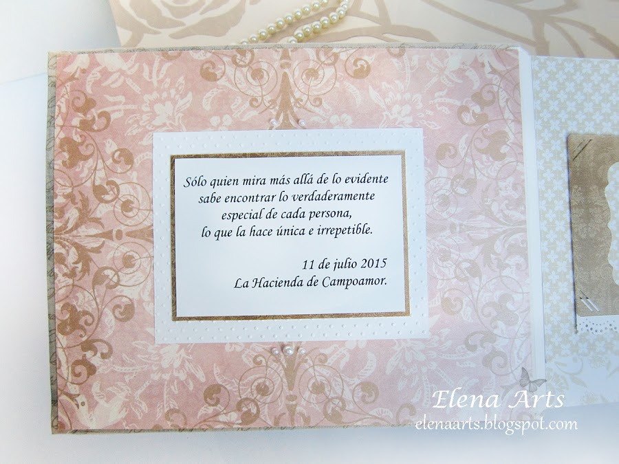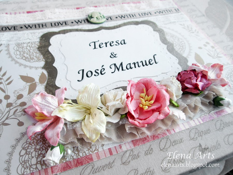 Las tapas están forradas de tela de algodón. La portada incorpora unos papeles decorados y embosados, troqueles, flores, cinta y encaje, además de los pequeños detalles decorativos.