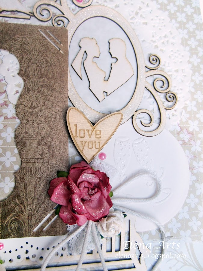 Algunos elementos de chipboard y flores, están cubiertos con glitter proporcionando más brillo y luminosidad a la composición.
