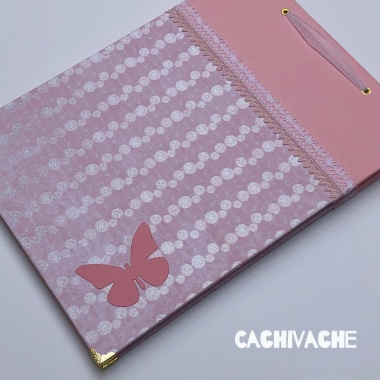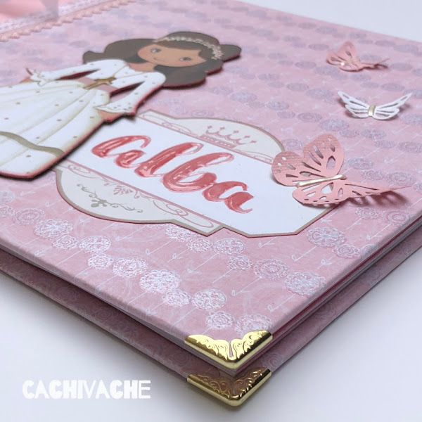 Con cantoneras en dorado para dar más elegancia y unas mariposas rematan la decoración...