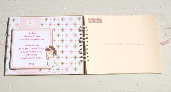 Y aquí os enseño el interior. Como siempre, con los datos de la ceremonia y varias páginas para colocar fotos. En la primera página, como en esta ocasión no sabía el tamaño de la foto que iban a colocar, solo estampé un sello de una cámara de fotos para indicar el sitio donde colocarla. Aquí me fue de gran ayuda mi amiga Silhouette Cameo, que gracias al Scan & Cut, me permitió cortar la hoja que trae la colección con adornos recortables. Me quedé con la niña y el cáliz. Al rosario que sujetaba la niña entre sus manos le puse un poco de Glossy Accents para darle volumen.