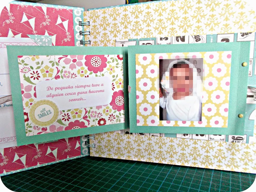 Cuando se abre la primera parte de la tarjeta se ve una foto de la niña de pequeña y un pequeño texto en referencia a su sonrisa ("De pequeña siempre tuve a alguien cerca para hacerme sonreír...").