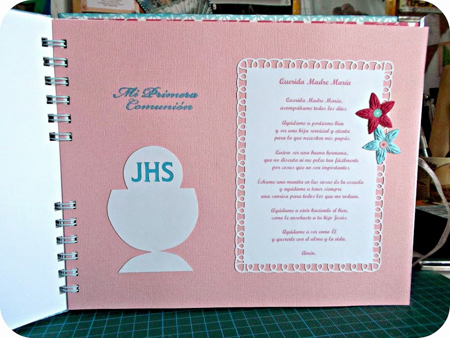 La página que sigue es muy sencilla. Sobre un fondo de cartulina texturizada rosa, he colocado una oración y un cáliz, ambos cortados con la Cameo, dos flores y un sello de la colección de comunión de Con Sal y Pimienta.