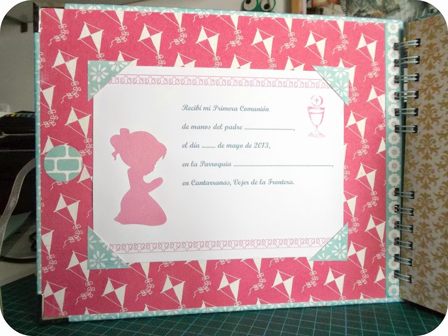 La parte interior de la portada la he querido dedicar a los datos de la comunión. La silueta de la niña rezando está cortada con la Cameo y el cáliz es un sello de la colección de comunión de Con Sal y Pimienta. Las flores celestes del borde son parte de las pegatinas que incluye la colección.