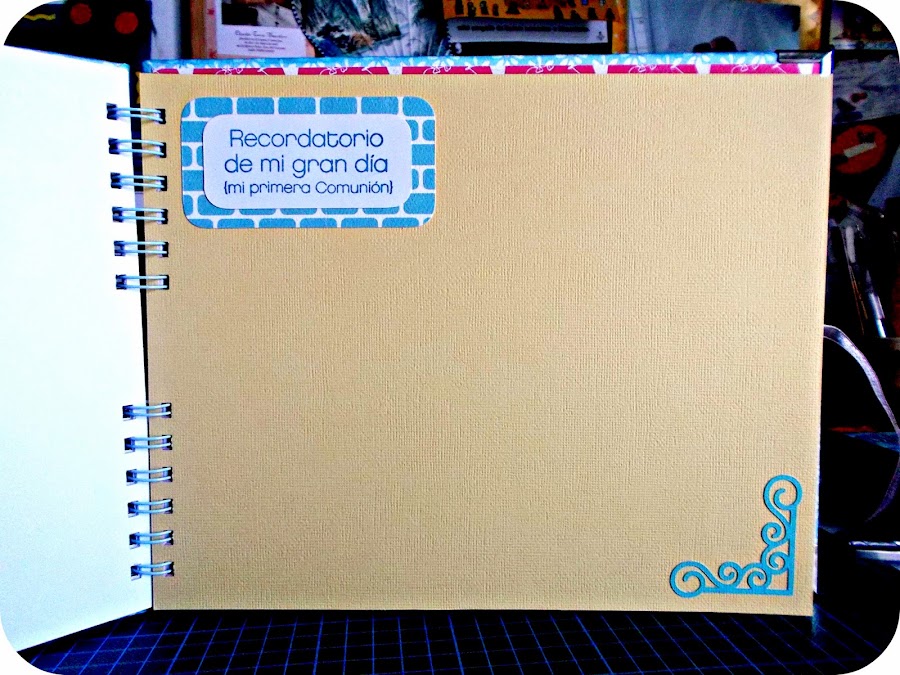 El marco, los embellecedores del encuadernado y las letras del nombre están cortados con la Cameo. Las letras llevan Glossy Accents para darles volumen. La niña de comunión es una impresión digital a color, pegada sobre el marco con cinta de doble cara de foam, para darle relieve. En las tres esquinas que se veían he puesto brads con purpurina del mismo tono celeste del papel de fondo.