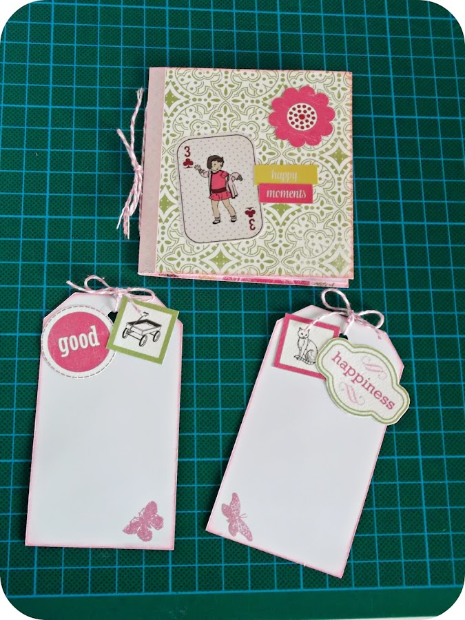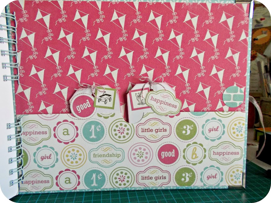 Por último, en la parte interior de la tapa trasera he puesto un bolsillo grande con dos tags. Los he decorado con recortes de papeles de la colección, un lazo de Bakers Twine rosa y con dos mariposas estampadas en las esquinas inferiores.
