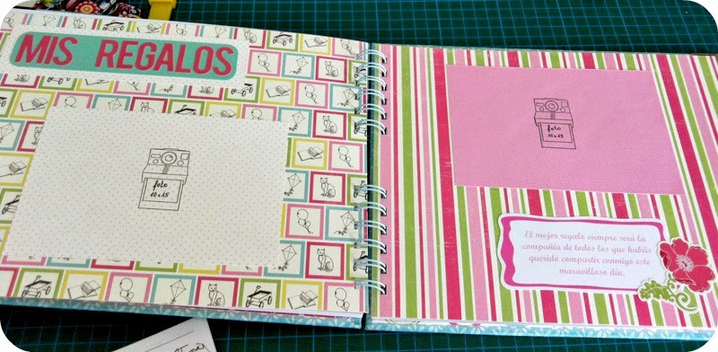Estas dos páginas están dedicadas a los regalitos de comunión, de ahí que haya querido darle un mayor colorido que al resto de páginas. He dejado dos huecos para que coloque fotos de los regalos o del momento en que se los entregaron. Las letras son parte del abecedaro adhesivo grande que incluye la colección, al igual que la flor de la segunda página. El texto de la segunda página ("El mejor regalo siempre será la compañía de todos los que habéis querido compartir conmigo este maravilloso día") lo he querido poner para resaltar lo verdaderamente importante del hecho de hacer la comunión.
