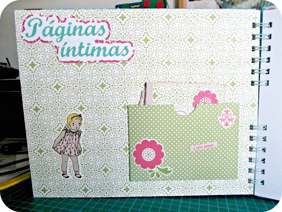 Al final del libro que querido incluir algunas páginas para que la niña anote sus reflexiones, pensamientos o para que las decore como quiera. Para decorar esta página el troquelado las letras y el doble contorno con la Cameo y les he puesto Glossy Accents. He querido colocar un bolsillo a juego que contiene una mini-libreta para escribir y he utilizado pegatinas de la colección para decorarlo. La niña mirando al bolsillo también es una pegatina de la colección.