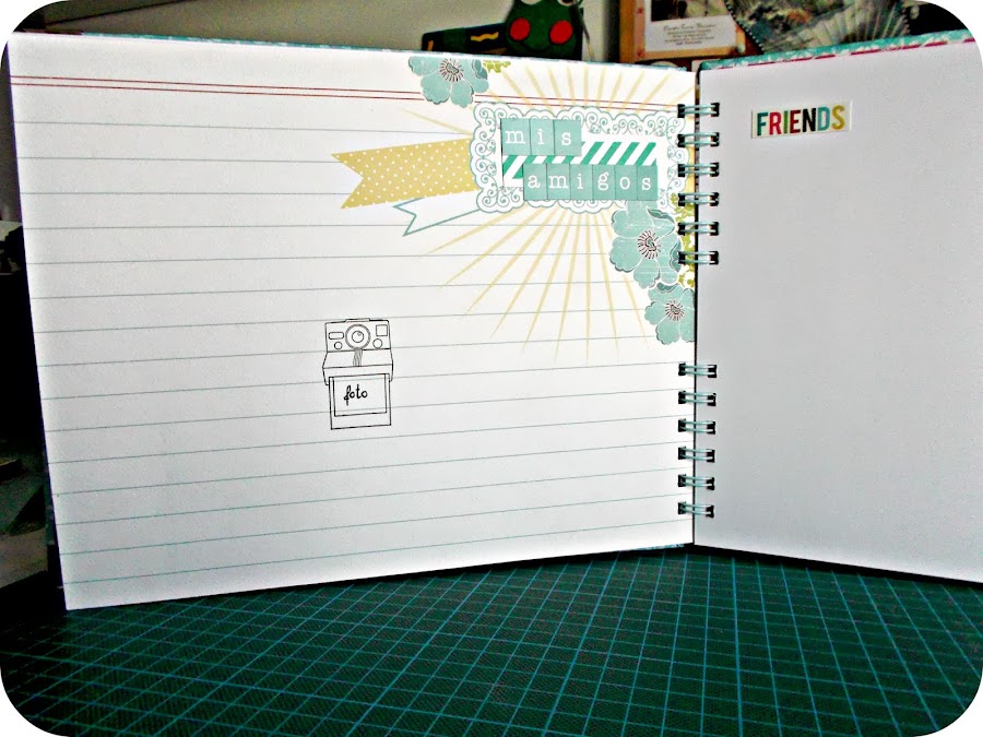Aquí empieza la parte dedicada a los amigos. Una primera página para la que he aprovechado el estampado del papel, al cual le he añadido la frase "Mis amigos" utilizando las pegatinas de abecedarios que incluye la colección, sobre un fondo de washi tape. Luego también he puesto páginas en blanco para que firmen los amigos de la niña.