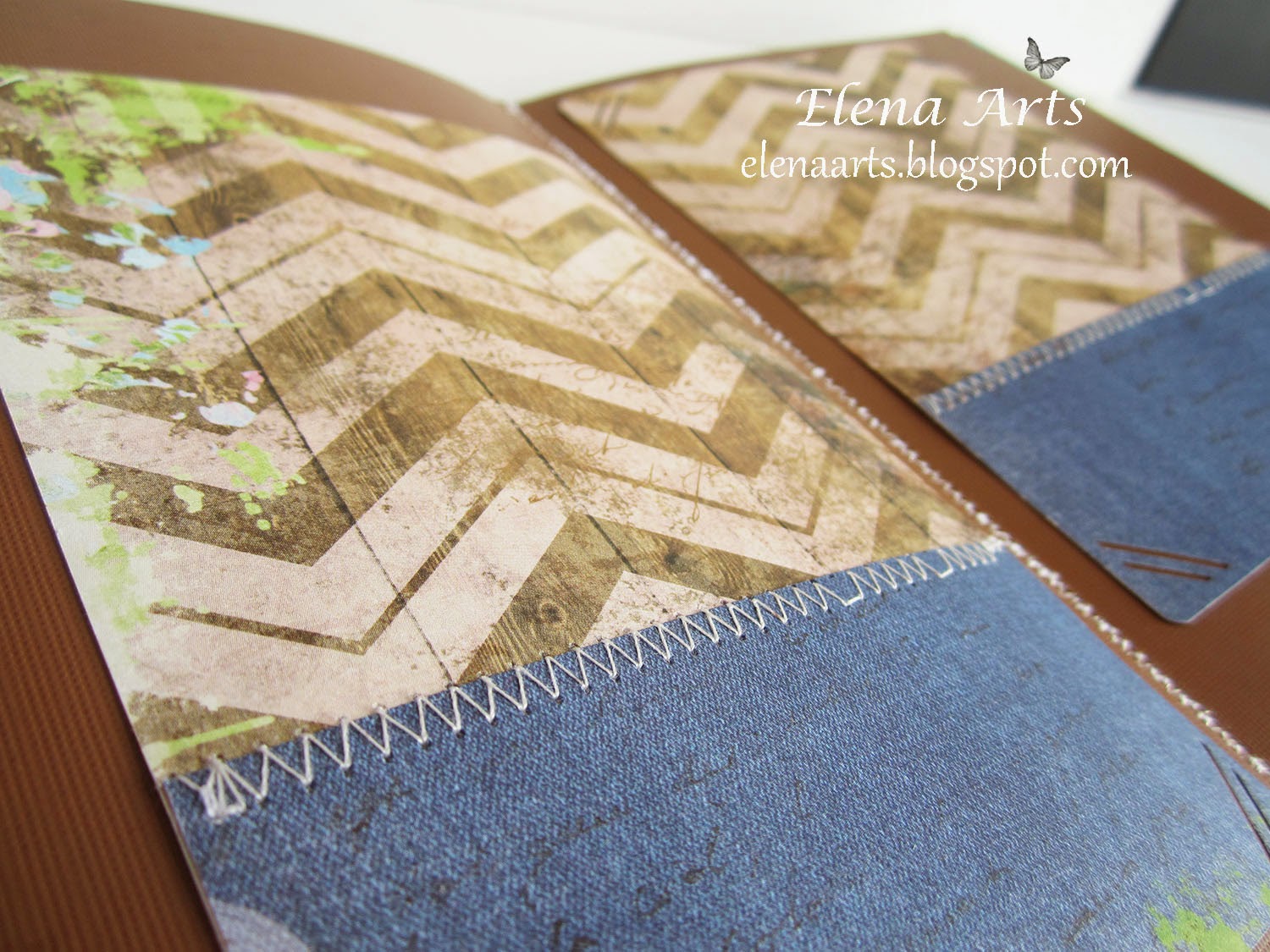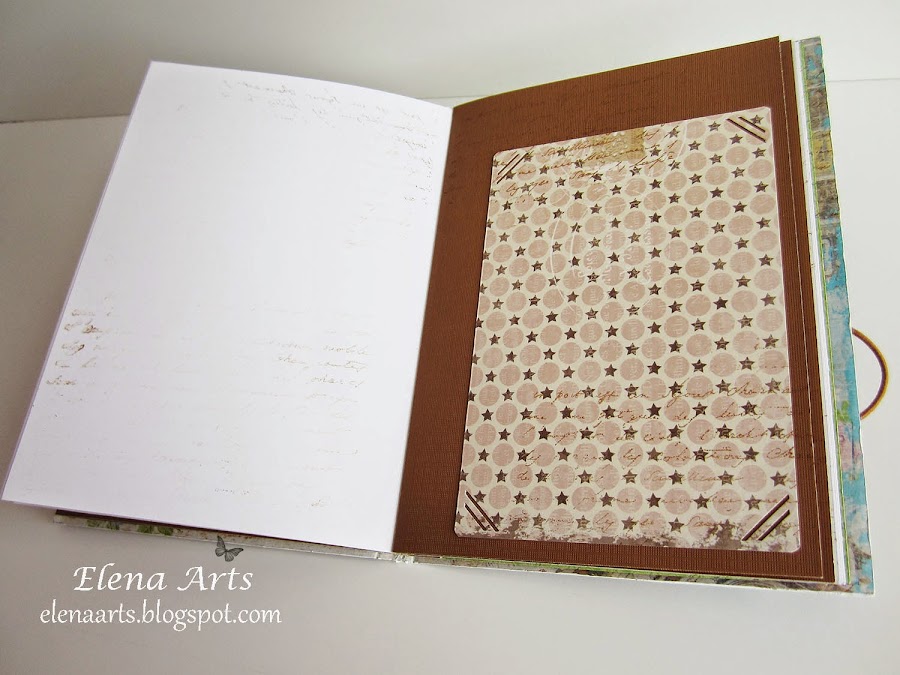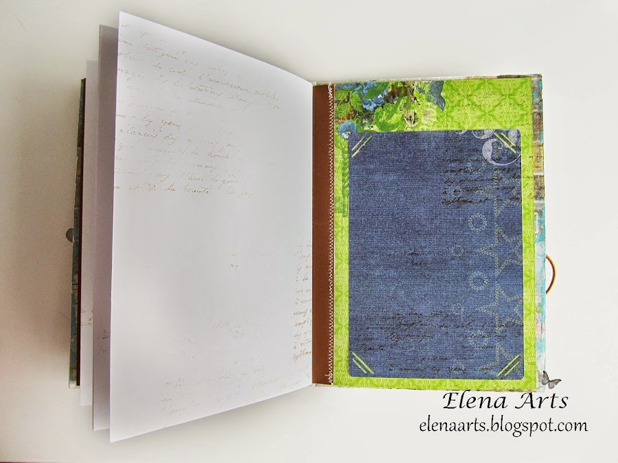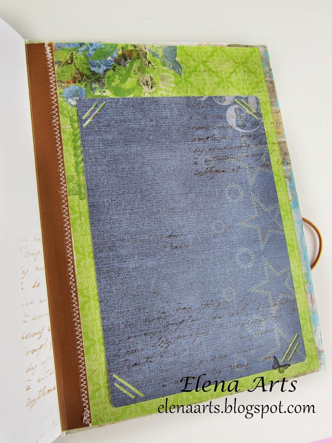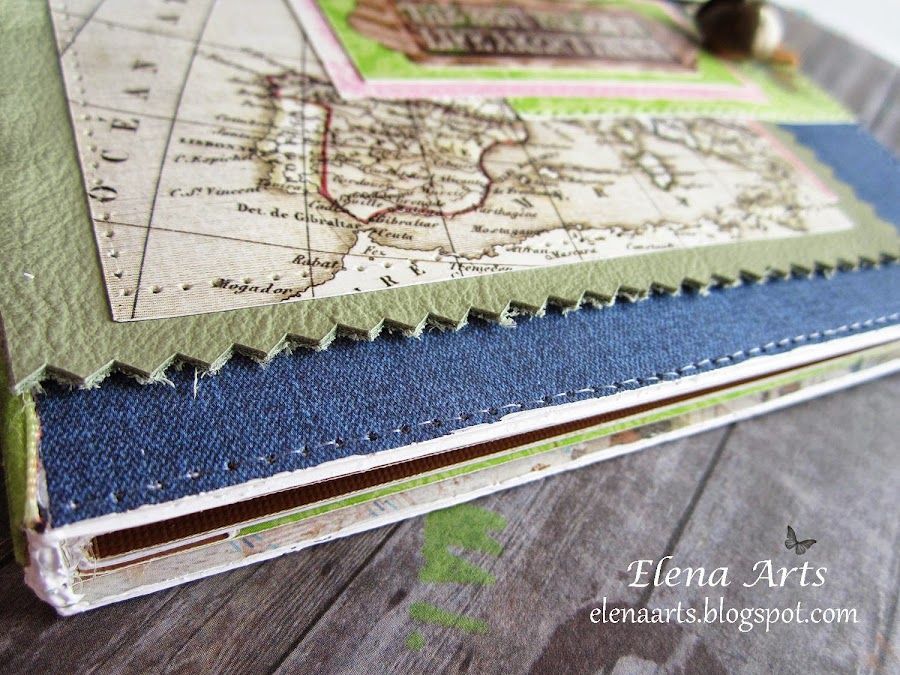 Para las tapas utilicé papel de Bo Bunny, un trozo de piel natural de color verde. Para más seguridad y que el libro dure más tiempo, todo lo cosí a máquina.
