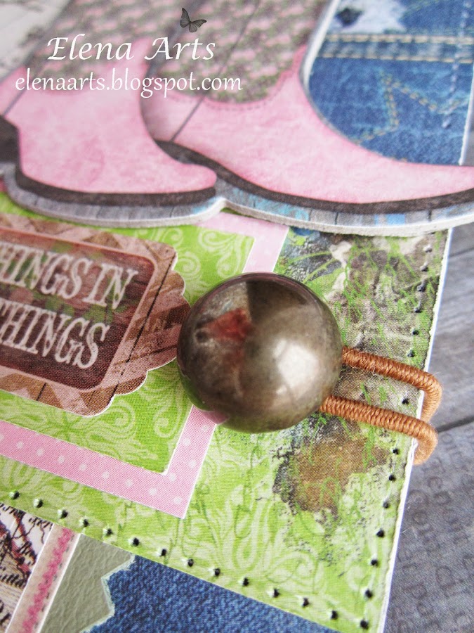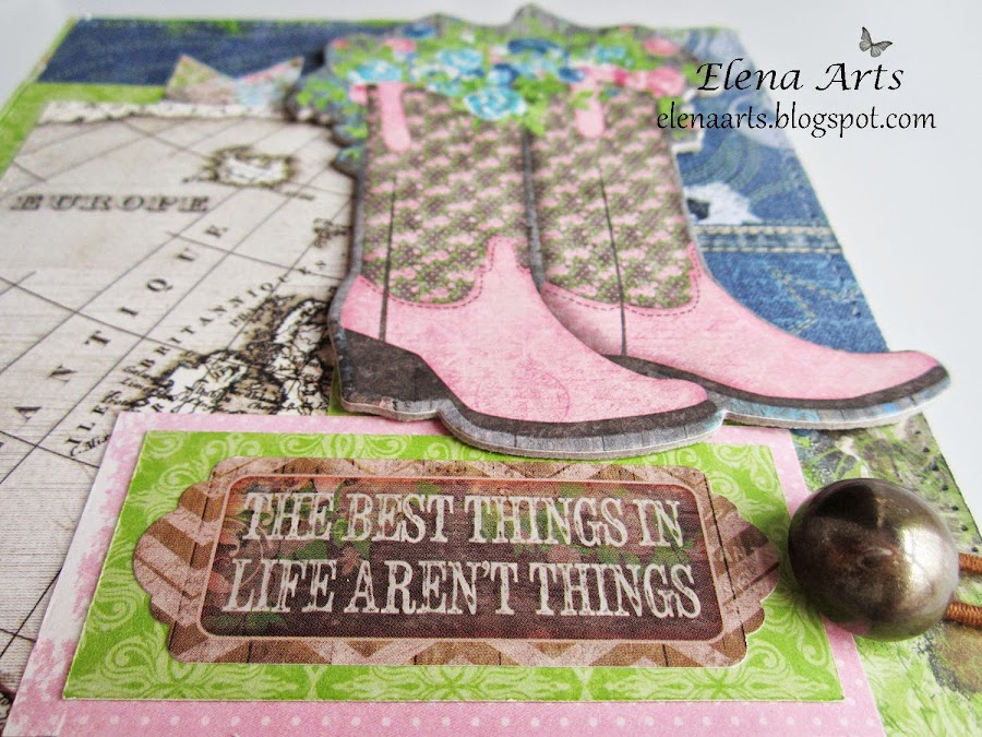Dado que se nuestra compi se iba fuera del país, en la portada puse un mapa mundial destacando España y arriba coloqué un par de botas de una collección de Bo Bunny.