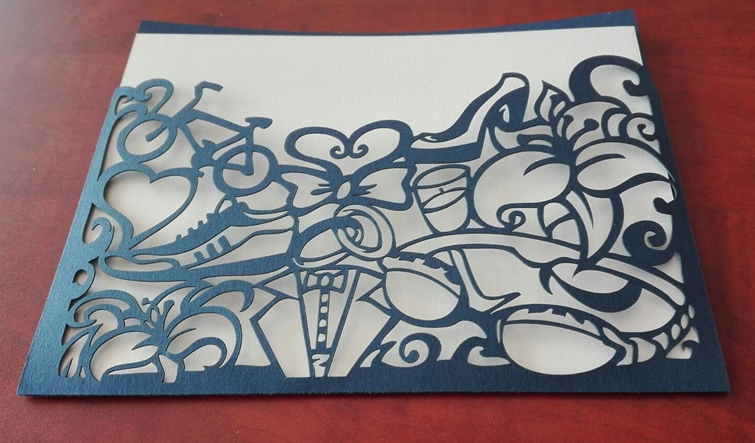 Una vez cortado y montado quedó muy bonito pues conseguí el efecto de textura que andaba buscando, y por supuesto su diseño que es genial, ella y su chico hacen triatlon y están unidos las tres categorías, mezcladas con temática de la boda, personalmente me encanta!.