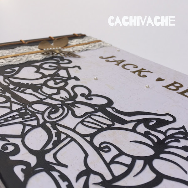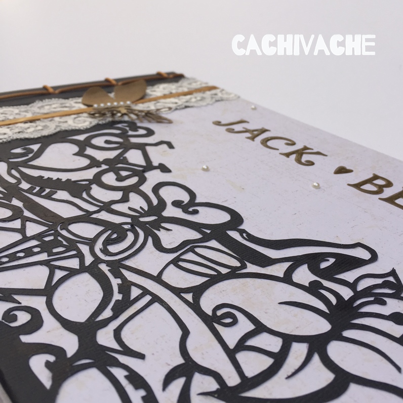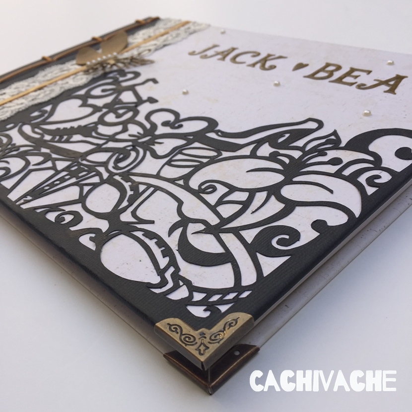 Las esquinas rematadas en cantoneras y el nombre de los novios con glossy, para darle más volumen.