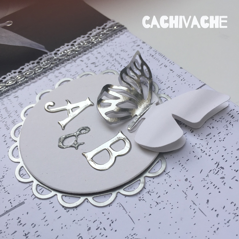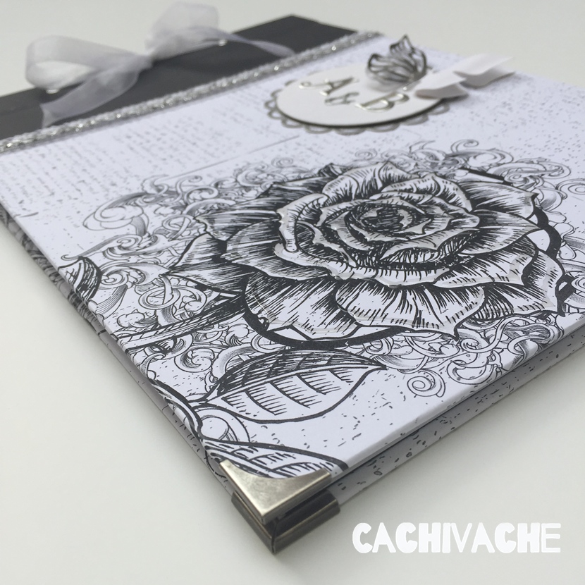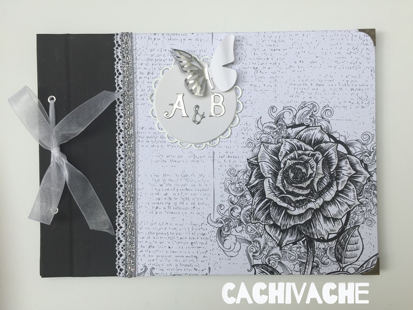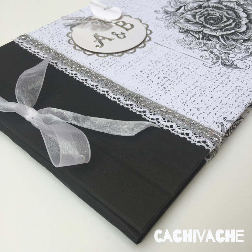 Una rosa colocada estrategicamente, una puntilla blanca y en plata, y una encuadernación en lazo cierra el conjunto...