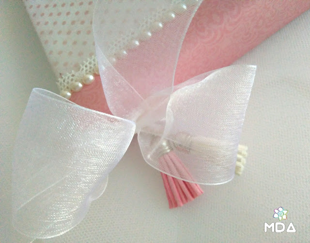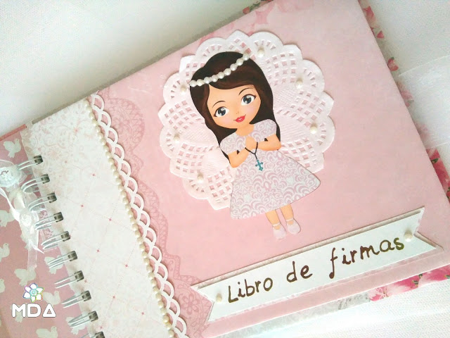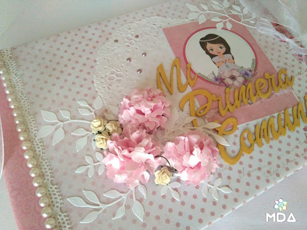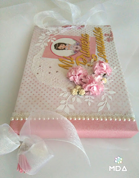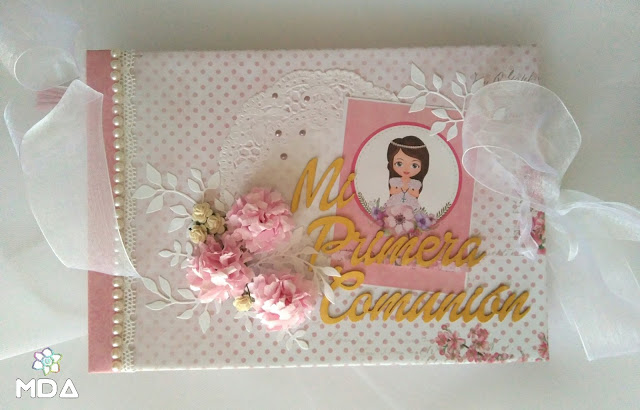 Las tapas, en cartón contracolado, están forradas con papeles en tonos rosas y grises de esta colección, además: puntillas, perlas, blondas, flores... y un chipboard con la frase "Mi primera comunión" que he pintado con acrílico en dorado para que quedara más sofisticado y elegante pero sin perder la dulzura de un trabajo como este.