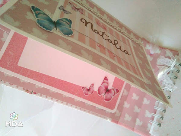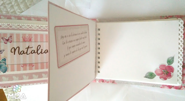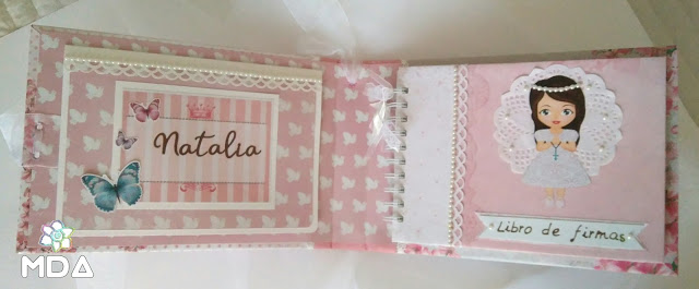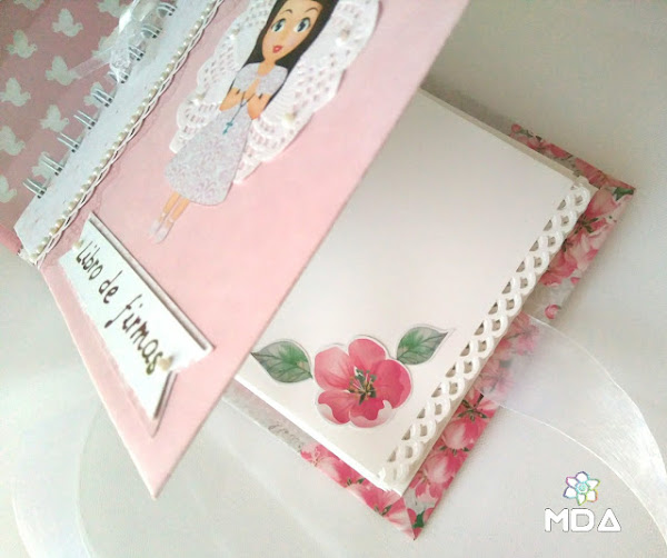 El libro de firmas tiene los bordes de las páginas troquelados para darle un toque más dulce y en cada una de ellas un elemento decorativo de esta bonita colección. Todo encuadernado con la Cinch. El tarjetón lleva el nombre de la destinataria del libro.