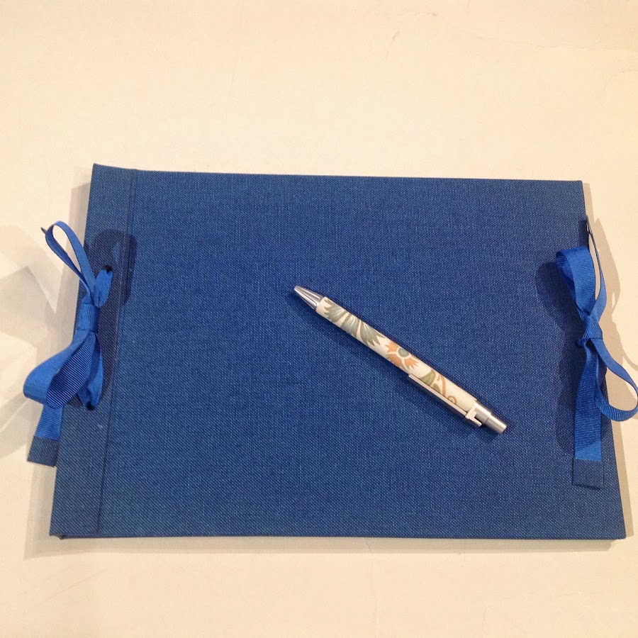 Papel serigrafiado italiano, tela bukram azul y boligrafo a juego