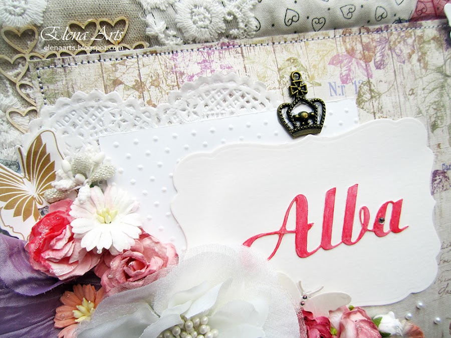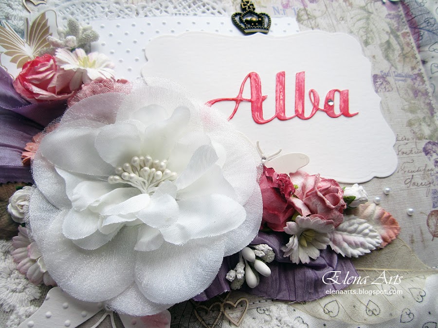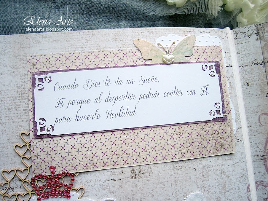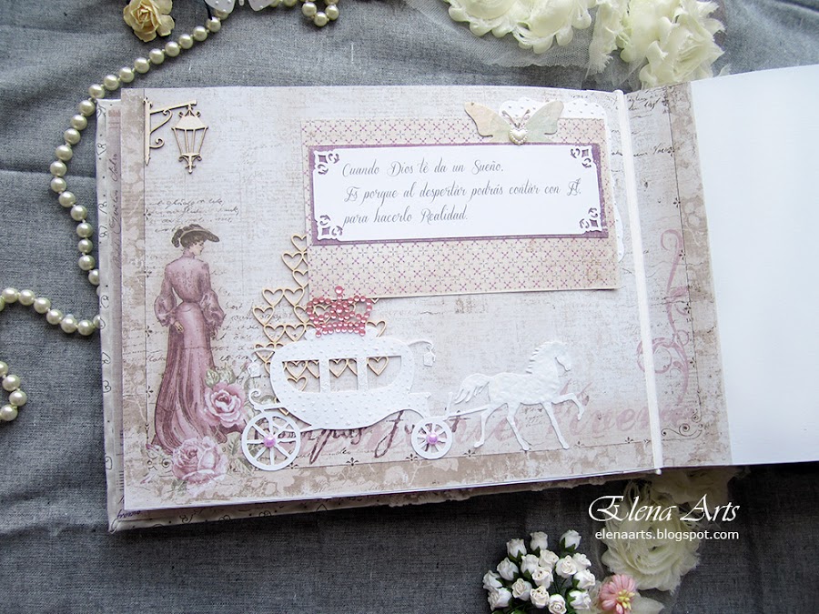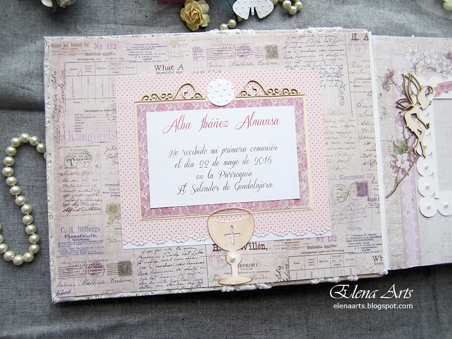Sonia, la mamá de Alba me envión una foto del vestido de Alba, que era precioso, blanco, con un fajín de hojas y flores lilas. Eso me inspiró a elegir los materiales y hacer un libro enfocándolo a hojas también.