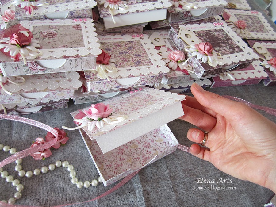 Para los invitados he hecho 45 mini cajitas para guardas un bloc de notas. Cada caja es distinta e incorpora diferentes elementos decorativos, igual que papeles decorados.