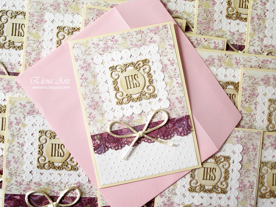 ...que es esa. El tamaño de la misma es 10x15 cm., con el elmento central de chipbord, un troquel de cenefa Doily de Martha Stewart, la cartulina blanca embosada en frio con una carpeta de lunares, y un lazo de un cordón fino.