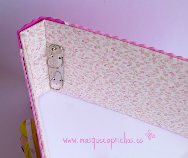 El interior esta realizado con la técnica del cartonaje forrado en tela, y para que añadir las hojas fuera más sencillo, tiene un sistema de anillas.