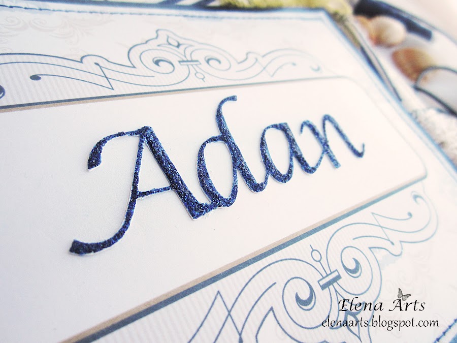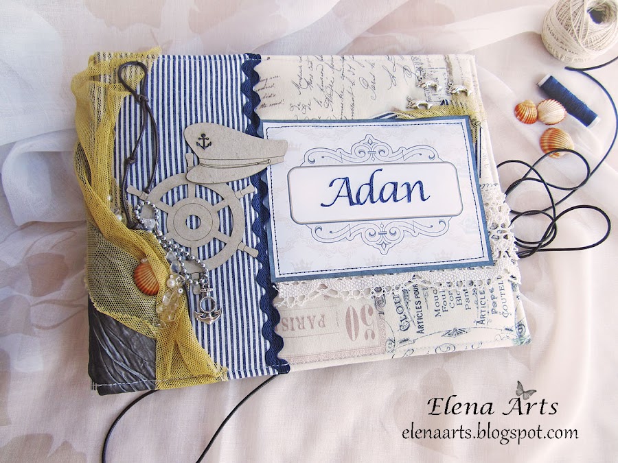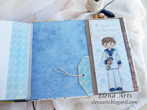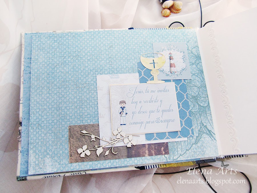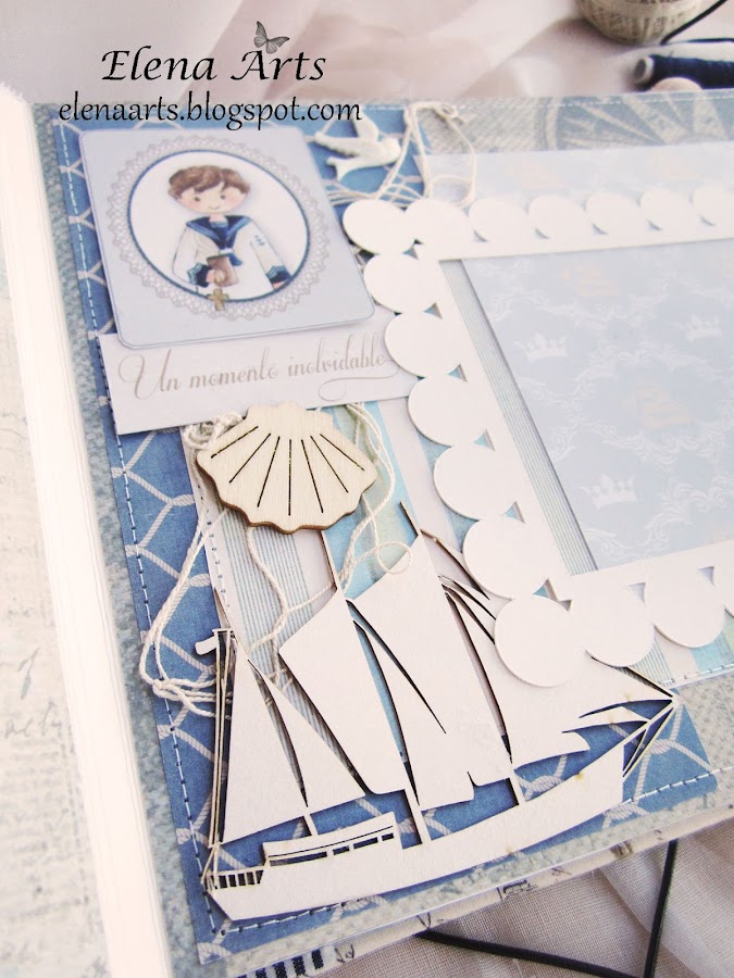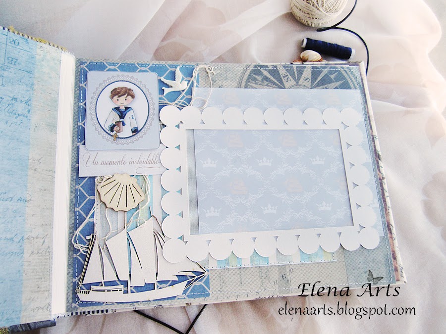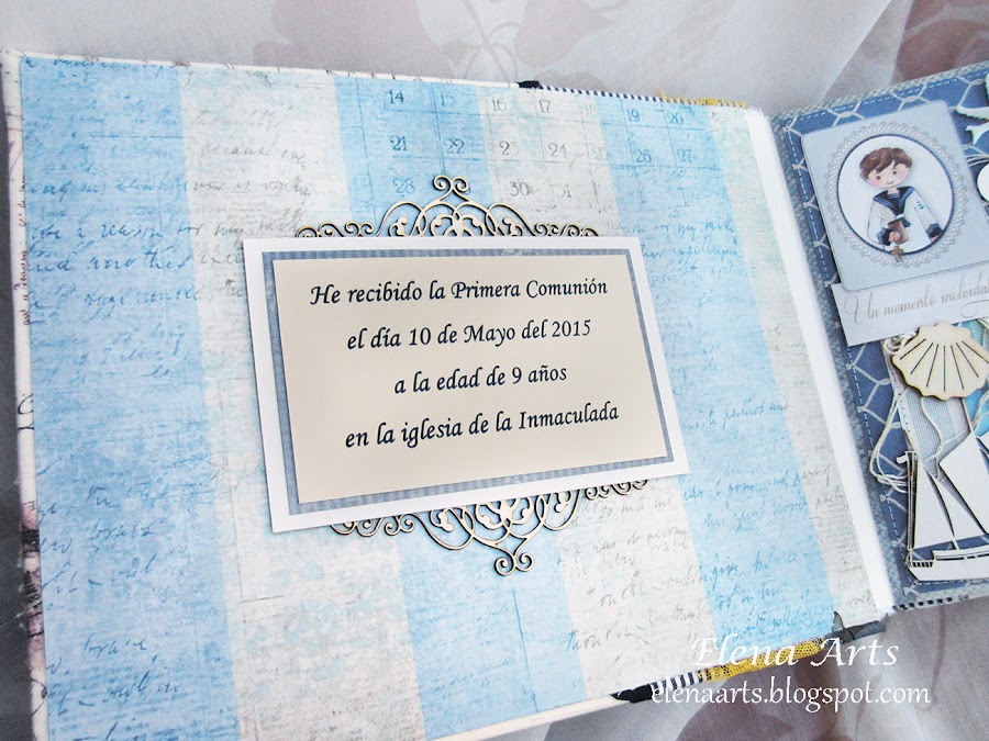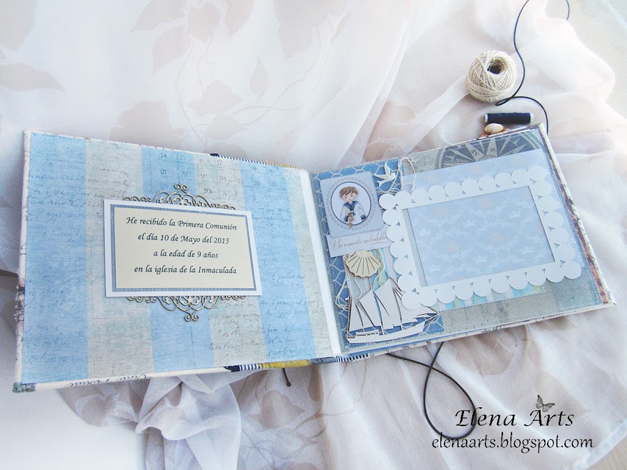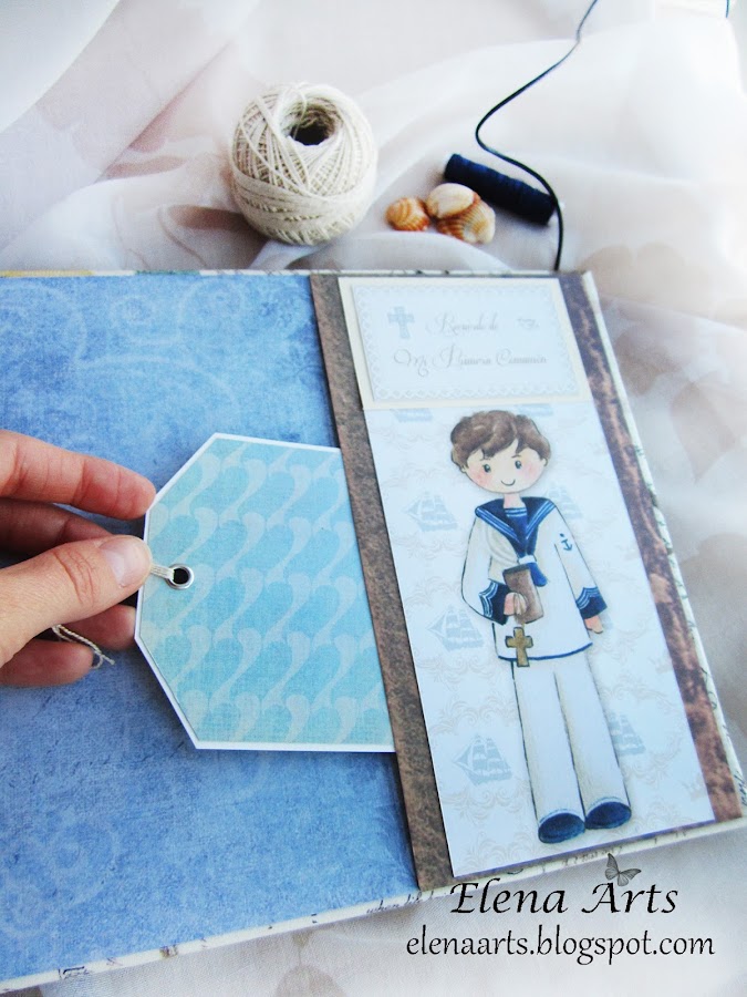 La primera página tiene un marco blanco donde irá la foto de Adan, está decorada con un velero y otros detalles marineros. En la contraportada está escrito un texto sobre cuándo y dónde se celebra la Comunión, tal y como se ha ha pedido que hiciera :) Así, el libro queda totalmente personalizado y único.