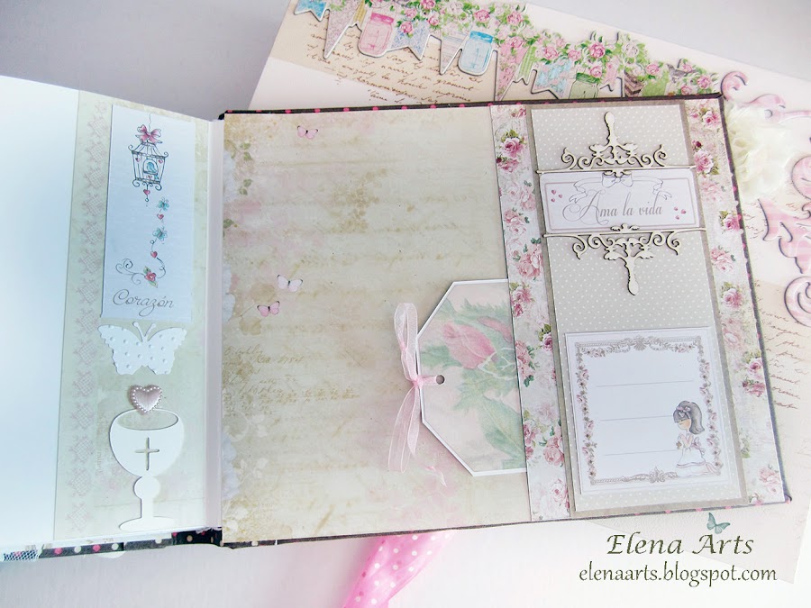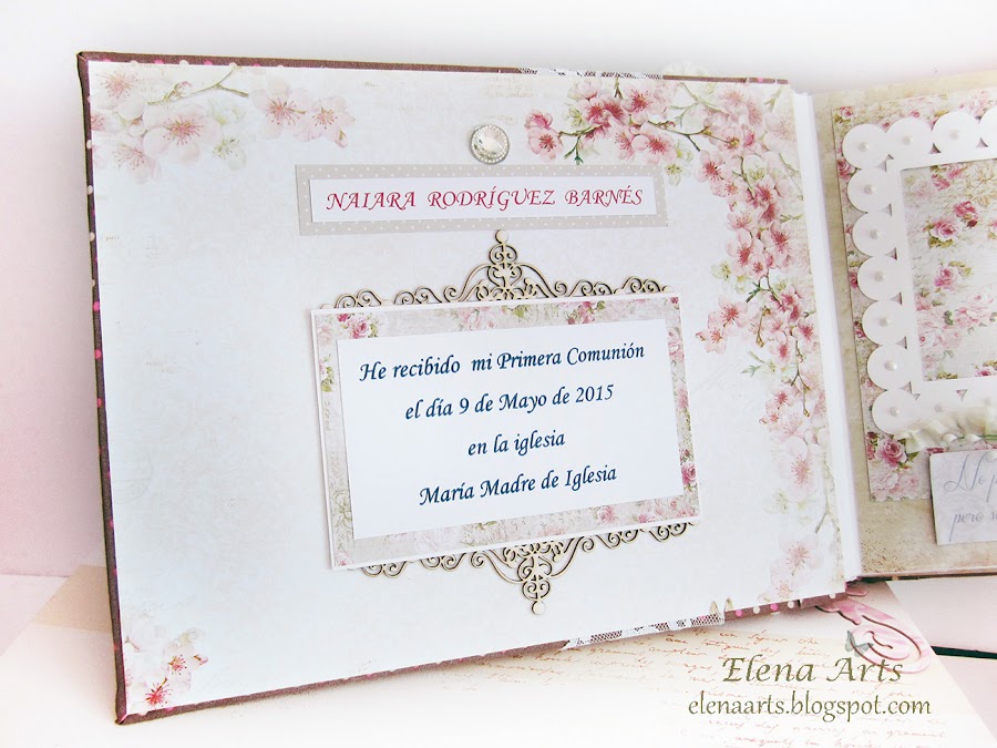 Hoy vengo con un trabajo muy completo. Se trata de un libro de firmas para la Primera Comunión y una caja de regalo a juego. La niña se llama Naiara y todo el conjunto está hecho en tonos marrones y rosa.
