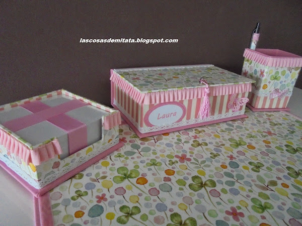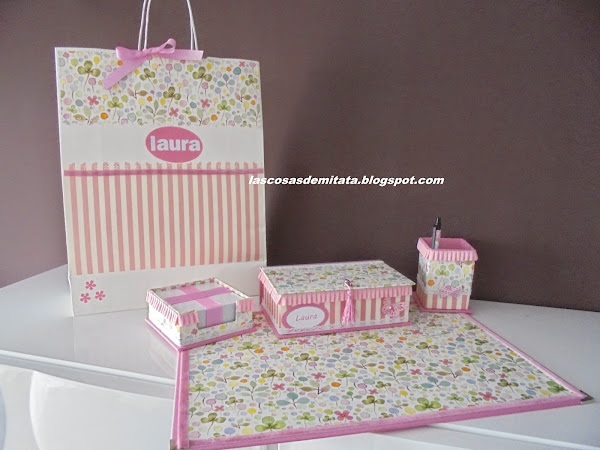 También un juego de escritorio en tonos rosas con flores y formado por vadé, estuche, porta notas y lapicero para la comunión de su mejor amiga Laura, un regalo super personalizado.