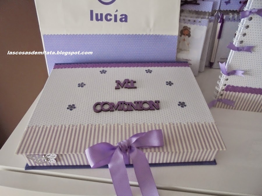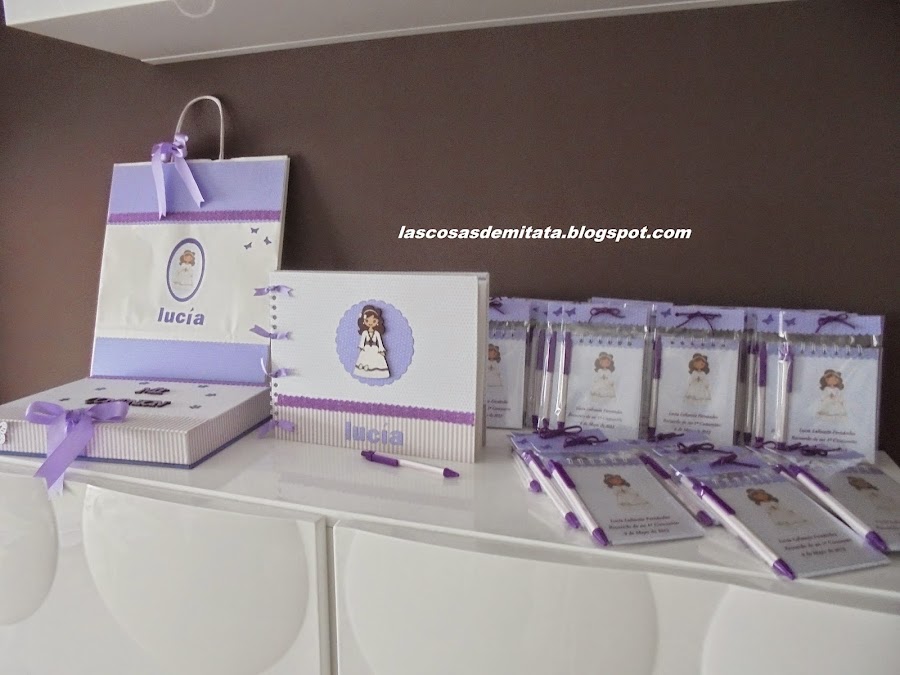 Hoy os enseño el conjunto de caja y libro de firmas en tonos lilas de la guapisima Lucía, junto a los regalos que repartirá, unas minilibretas con bolígrafo.