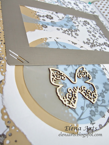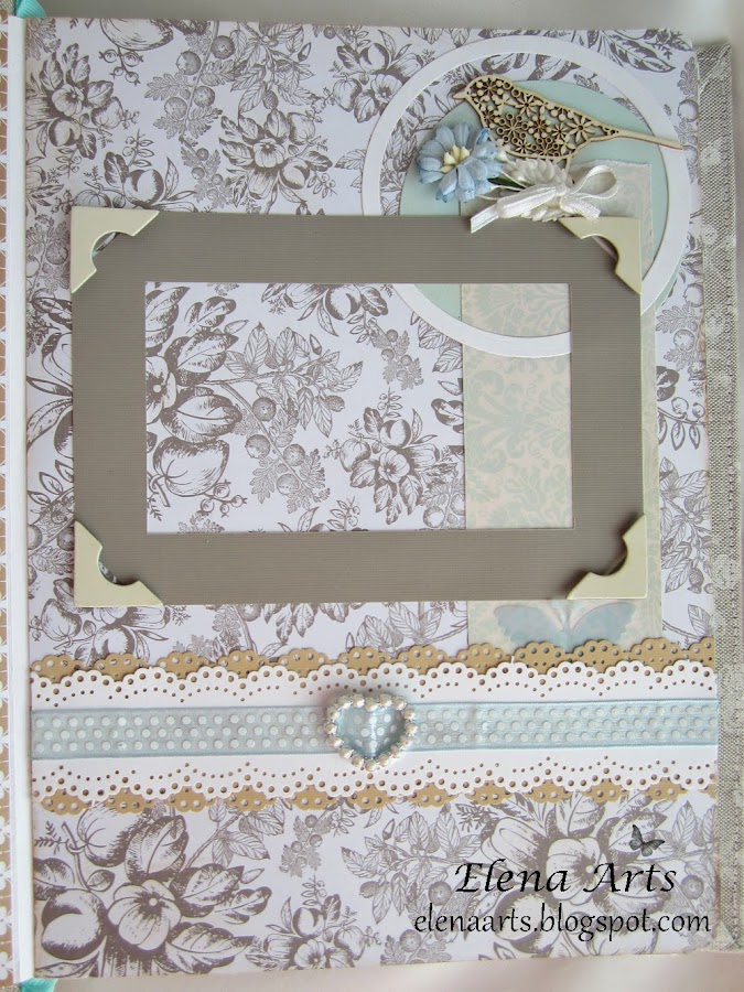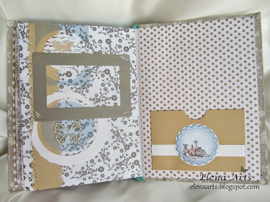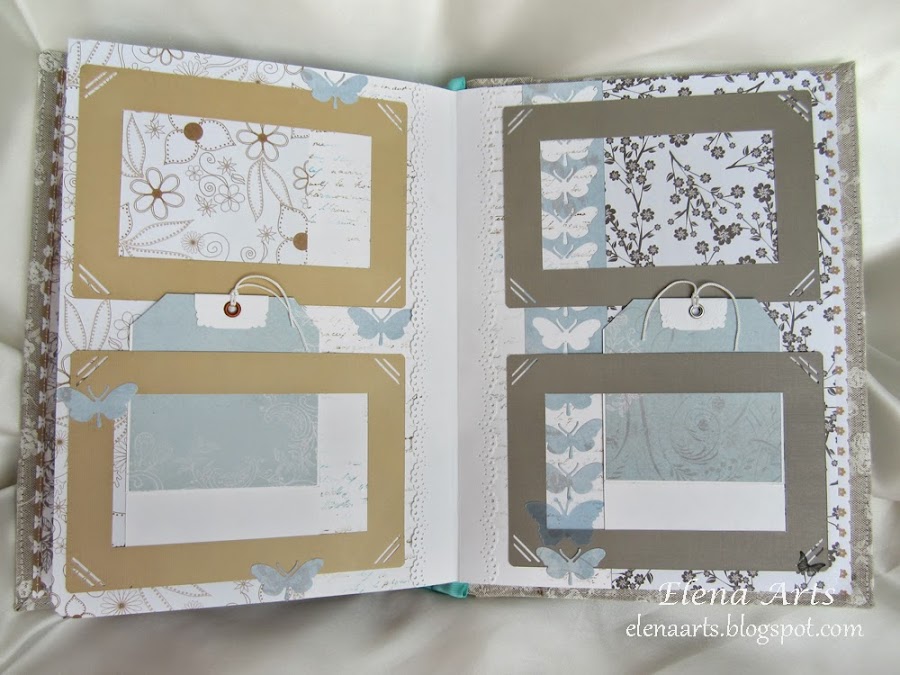 En la parte trasera hay 4 páginas para poner 6 fotos. Todo está combinado en los tonos grises y beige con unos toques de azul.