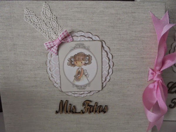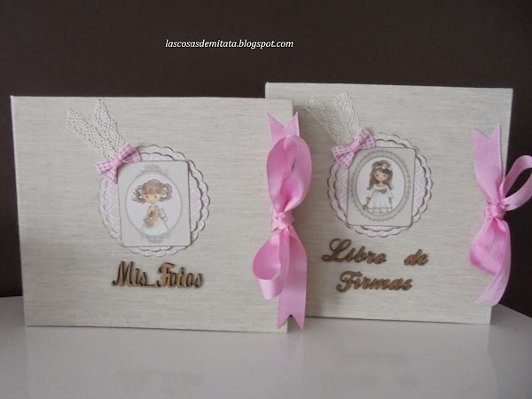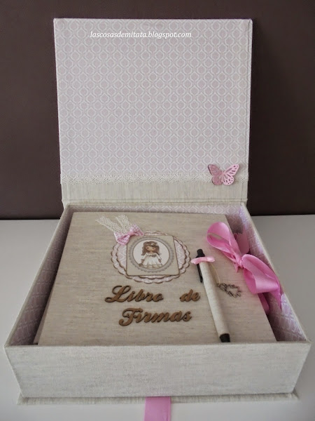 En esta ocasión os muestro un Libro de Firmas con bolígrafo para Comunión realizado en tela de lino y combinado con papel Dayka y detalles en tonos rosas.