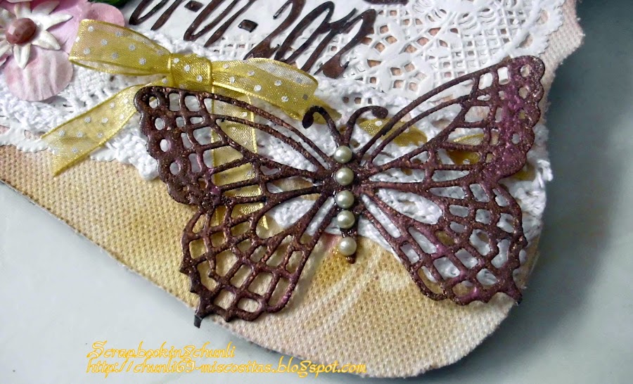 Hoy os traigo otro encarguito.... esta vez un libro de firmas..., la verdad que cuando me lo encargaron lo tuve claro, usaría esa forma tan chula que me encanta y lo forraria de lienzo "guarreado" con mis glimmer y distress, usando esa mariposa tan divina de máscara... ladecoracion la hice o intenté hacerla en plan shabby chic. La mariposa y las letras están embosadas con una primera capa color cobre, después una segunda capa de utee y por último una tercer capa de perfect pearl cramberry. Las flores están teñidas con glimmer y esas hojitas tan divinas son alfileres muy bonitos sinceramente... Las hojas interiores están estampadas en vintage sephia con un sellito de la marca tpc y los bordes todos entintados con vintage foto...
