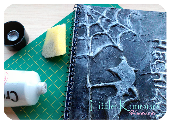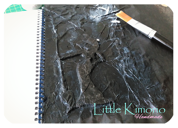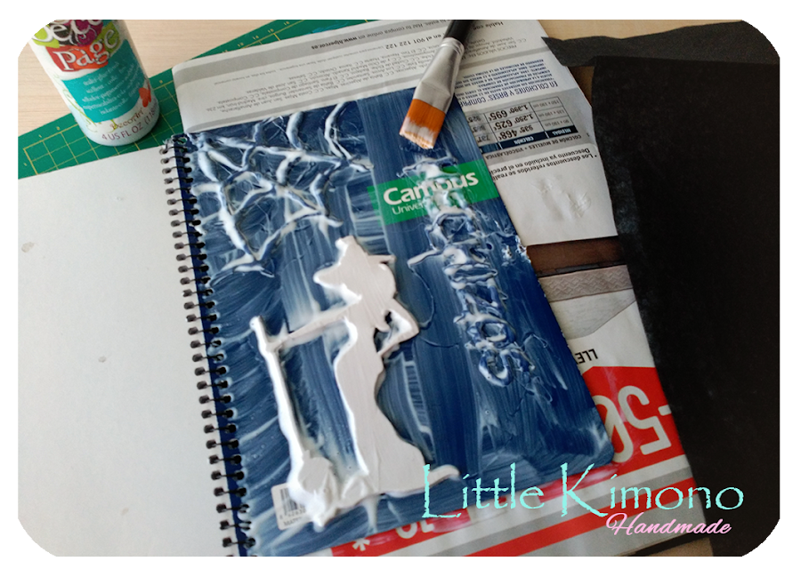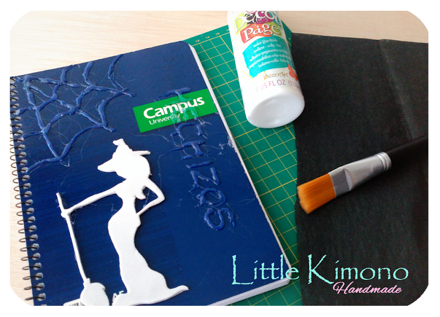 3. Llega el momento de usar la cola de decoupage, con nuestra composición hecha, damos una capa de cola por toda la libreta y seguidamente colocamos el papel seda encima. De nuevo aplicamos otra capa de cola siguiendo las formas de las siluetas ayudándonos con el pincel.