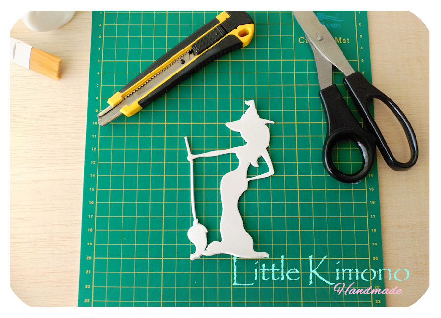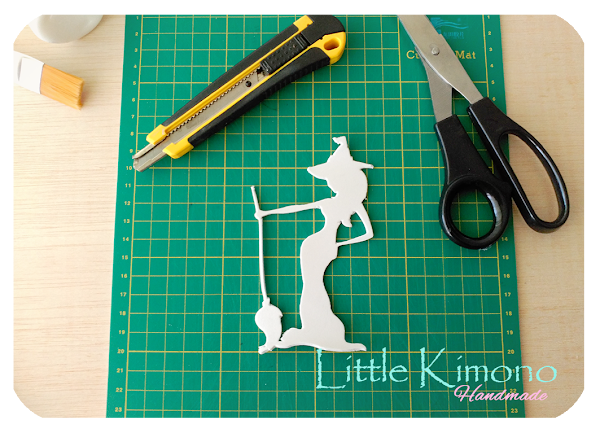 2. Recortamos algunas siluetas en goma eva, yo elegí una bruja ^_^ y las pegamos en la libreta con el pegamento termofusible.